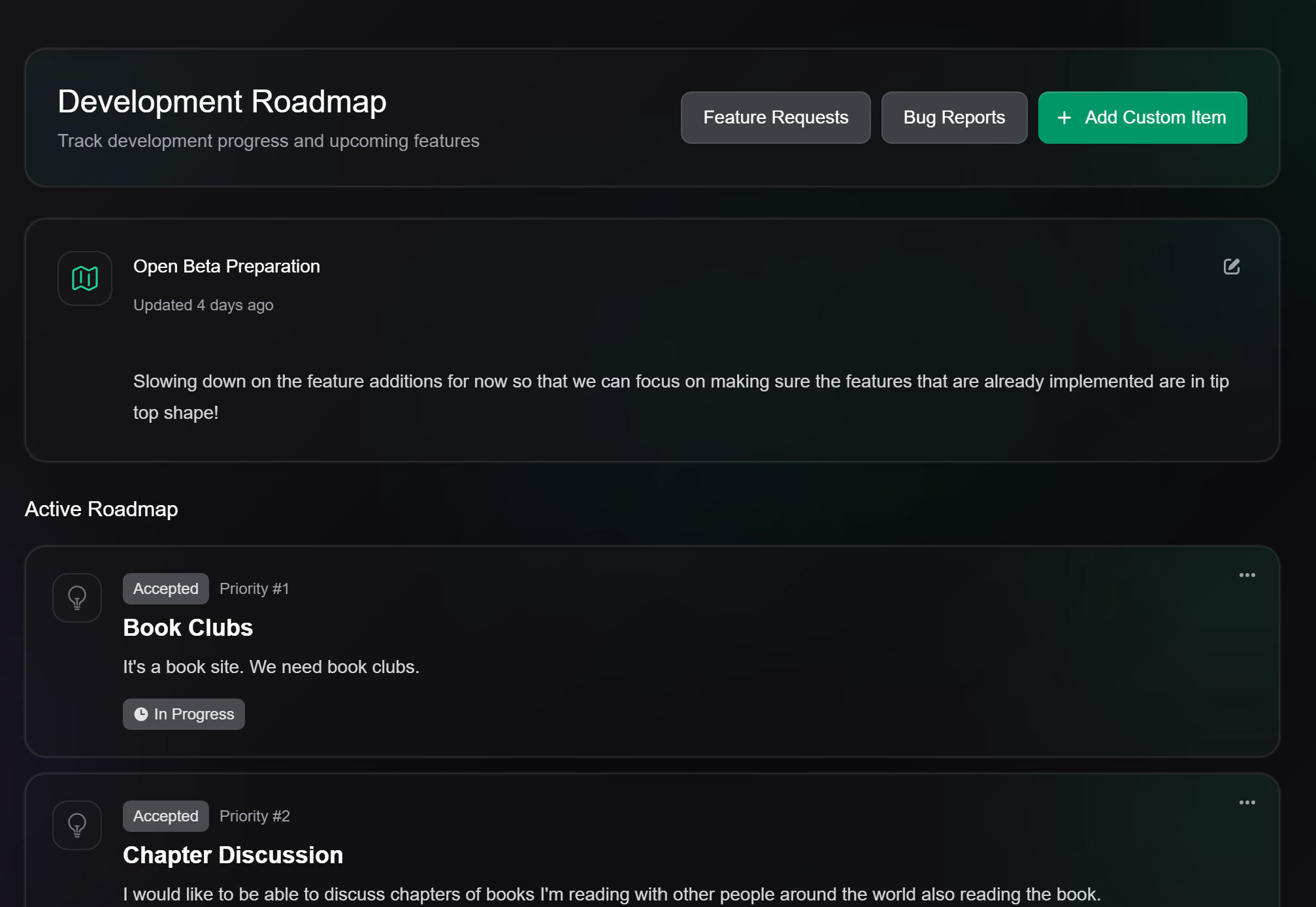 Development is driven by reader feedback. Submit feature requests, upvote ideas you want to see, and track progress on our public roadmap. See what's being worked on, what's planned next, and what's been completed. Your input directly influences what gets built and when.