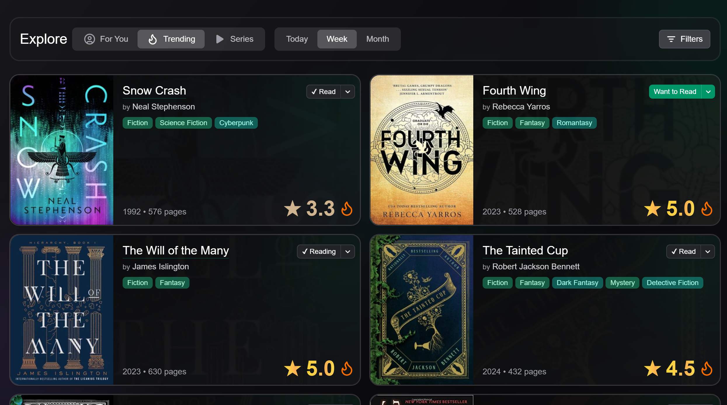 Browse trending books gaining momentum across the community to see what readers are currently loving. The "For You" feed analyzes your highly-rated books and surfaces recommendations from readers who share your taste: people who loved the same books you did. Genre classifications are crowd-sourced and verified by the community, ensuring accurate categorization. Filter by genre, publication date, or reading period to explore books that match your interests and reading mood.